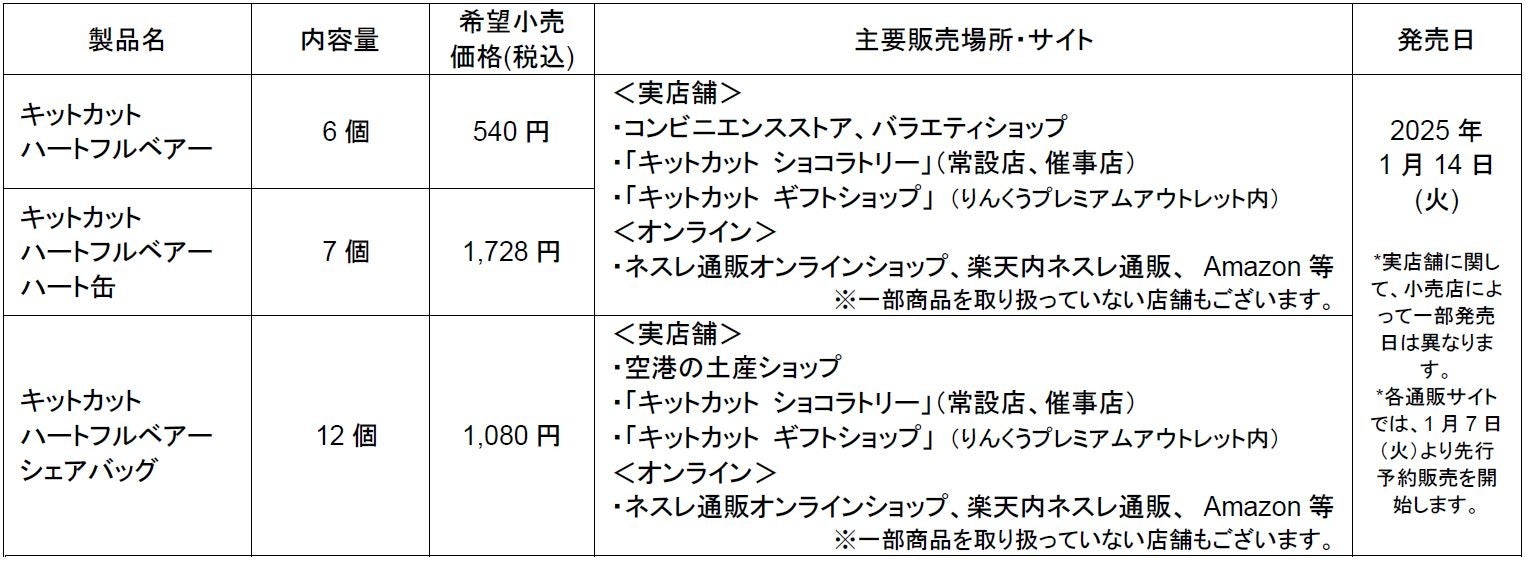 今回の「キットカット ハートフルベアー」は1月14日(火)よりシーズン限定で3種のラインアップでスタート。自分用やみんなでシェアするシーンにぴったりな”小袋”タイプと、家族や友人とのパーティーや職場で同僚にシェアするシーンなどにぴったりな”大袋”タイプに加えて、日頃の感謝の気持ちを特別感あるパッケージで伝えるプレゼントシーンにおすすめの”ハート缶”タイプを発売します。