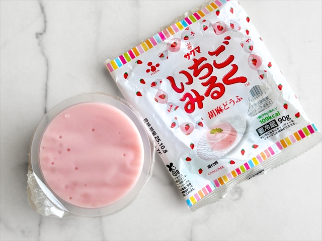 ミルク感あるまろやかな甘み、ほんのりとしたいちごの甘酸っぱさが完全再現されていて、いい意味で「胡麻どうふ」感がありません。口当たりもなめらかで、「胡麻どうふ」というよりは、ミルクプリンのよう。