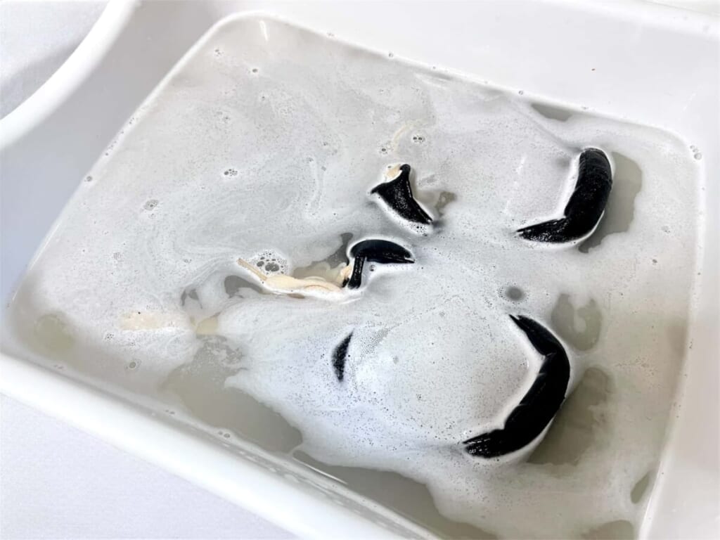放置している間も、酸素の力でシュワシュワと泡が発生します。靴底から表面まで全体を沈めたら、素材が傷むのを防ぐため、20分を目安に浸してください。